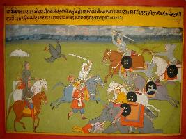 | Description / विवरण | Miniature painting based on Prithviraj Raso depicting Langri Rai fighting bravely with the armies of Jaichand and injured by canons. |