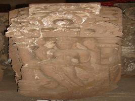 | Description / विवरण | An independent sculpture of chanwari bearer in a niche. She is holding the chanwari by her right hand and left hand is missing from elbow, adorned with necklace girdle, tussels and garland. The lower most part of legs are missing. The chanwari bearer beautifully ornamented with nice head gear and above the figure here is a depiction of floral and amlak design. |