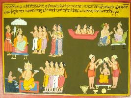 | Description / विवरण | Miniature painting based on Mahabharat - Gada parva depicting Vaishpayan telling Jamejeya story of tirth which Baldev is visiting. Gods went to Varun to meet him. They asked him to become to king of water body andare shown doing coronation. |