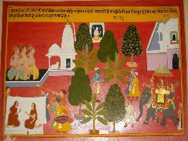 | Description / विवरण | Miniature painting based on Sanskrit drama Malti Madhav depicting Malti coming to the park and Kamandiki telling avlokita that by sawing her cleverness she got the glimpse of her friend Saudamini s face on her. |