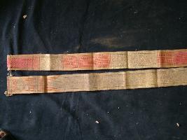 | Description / विवरण | Silk ground with horizontal strips of gold thread arranged to form a geometrical like pattern. A rectangular shaped design is on one side corner . |