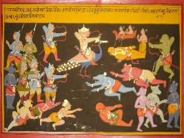 | Description / विवरण | Miniature painting based on Mahabharat - Gada parva. The painting depicts a battle scene that took place between Devtas and Demons and the Kartikaya is seen riding in peacock. |