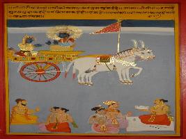 | Description / विवरण | Miniature painting based on Shri Bhagwat Gita. Krishna preaching Arjun, meditation is important exponent of life. |