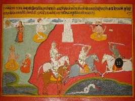 | Description / विवरण | Miniature painting based on Prithviraj Raso depicting Chandvardai telling that the Sun can start rising from west, earth becomes heavy on the hood of Sheshnaag, Mahadev becomes fairer, Brahma stops reading his Veda, Yudhisthir starts telling lie, Meru Parvat can start shaking but Prithviraj can never forgive his enemy. At the middle, Prithviraj s army shown fighting with army of Jaichand. |