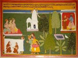 | Description / विवरण | Miniature painting based on Sanskrit drama Malti Madhav depicting Kamandiki and Avlokita making the plan and schedule of meeting of Malti and Madhav. |