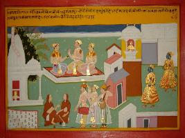 | Description / विवरण | Miniature painting based on Sanskrit drama Malti Madhav depicting Avalokita asking Kamandaki that why Bhuri vasu marrying her his daughter without any celebration. Then Kamandaki replied that as everyone knows about love of Malti and Madhav so he is forced to do so. |