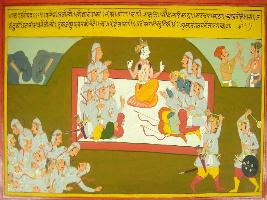 | Description / विवरण | Miniature painting based on Mahabharat - Gada parva. It depicts Bhim is telling Duryodhan that only because of him Pandavas killed Bhishma, Drona, Sakuni, and his 99 brothers and today he will kill Duryodhan. At the lower left Bhim and Duryodhan depicted fighting with each other. At the centre Balram is seen talking with Pandavas. |