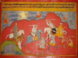 | Description / विवरण | Miniature painting based on Prithviraj Raso depicting army of Panga fighting with army of Prithviraj. At the lower right, elephants are shown on the crocodile. At the upper right, Kaal is shown eating man and Surya is shown to its left. |