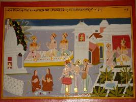 | Description / विवरण | Miniature painting based on Sanskrit drama Malti Madhav depicting Kamandaki telling Avalokita that by seeing Madhav s face Bhurivasu will agree for the marriage. |