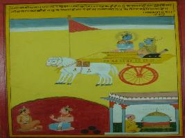 | Description / विवरण | Miniature painting based on Shri Bhagwat Gita. Arjun telling Krishna that he cannot kill his kinsmen. He is ready for any disaster if he would not have to kill. He further said that if he got happiness after killing his kinsmen, this would mean nothing to him. |
