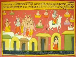 | Description / विवरण | Miniature painting based on Mahabharat - Gada parva depicting Janmejeya telling Vaishpayan that one upon a time there was of 12 years. Then 7 sages went to ashram of Arundhati. Mahadev also in guise of Brahman and asked for food. Arunnadhti rishi gave him Ber. After this, Mahadev went to Indra with sage daughter. |