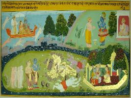 | Description / विवरण | Miniature painting based on Geet Govind depicting Jaidev with folded hand in front of Krishna at the upper left. Below this, Sita is shown sitting with female demon in Ashok Vatika. To its right Ram and Laxman, shown standing with army of monkey and Ravan and his demons are shown lying on ground and dead. Above this, Ram is sitting with Sita and nearby Kuber standing in a yaan flying to Ayodhya. |