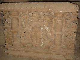 | Description / विवरण | An independent sculpture of eight armed Durga depicted on a niche standing on lotus pedestal. Attributes from right below 1 in Varada mudra, 2 Sword 3 Trident 4 Arrows 5 Shield 6 Bell 7 Bow 8 Kamandal. She is adorned with garland, earrings, vanmala, bangles, armlets and girdle and have hatband. She is flaked by two tigers. Above this two celestial figures are seen. At the right and left side two female chanwari bearers are seen holding chanwaris in their hand; at the lower part, while on the upper part two mythical animals are seen. |