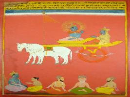 | Description / विवरण | Miniature painting based on Shri Bhagwat Gita. It depicts Krishna preaching Arjun that he who worships me with his soul is the best in this earth. Here the Adhyaya 6 is finished that is written in the patronage of Maharana Shri Jai Singh Ji by Bhat Kishan Das. |