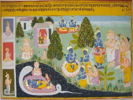 | Description / विवरण | Miniature painting based on Geet Govind depicting lord Vishnu resting on Sheshnaag with Lakshmi and Brahma on the right hand side of the painting above it Brahma teaches a child and on its left lord Vishnu standing with lord Brahma and other gods. |