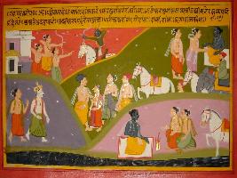 | Description / विवरण | Miniature painting based on Mahabharat - Gada parva depicting Baldevs arrival to Parshuram Tirth where Kashayapa rishi is performing penance with horses, cows, maids and wealth. |