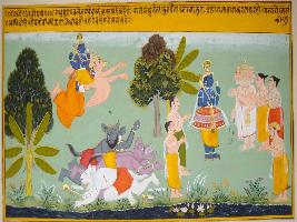 | Description / विवरण | Miniature painting based on Geet Govind depicting lord Vishnu seated on his vehicle Garuda. In this painting, Jaidev depicts Krishna as the destroyer of Madhu, Moor and Narkasur demon. |