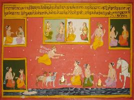 | Description / विवरण | Miniature painting based on Mahabharat - Gada parva. Brahmans are depicted here doing Ashwamegh and Pasumadha. |