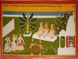 | Description / विवरण | Miniature painting based on Sanskrit drama Malti Madhav depicting natas and sutradhara leaving the place and Kamandaki coming in the disguise of Avalokita. |