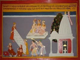 | Description / विवरण | Miniature painting based on Sanskrit drama Malti Madhav depicting natas seeking permission from the king to start the play and introducing Kamandaki who is wearing a saffron dress and one nata is taking the form of Avalokita. |