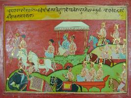 | Description / विवरण | Miniature painting based on Mahabharat - Udyam parva depicting Krishna sitting with Vidur in one chariot. Druyudhana is sitting with Sakuni and Yadavs sitting on their chariots and moves to court of Dhritrashtra. |