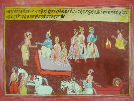 | Description / विवरण | Miniature painting based on Mahabharat - Udyam parva depicting Krishna making various alms. There is depiction of a chariot driver coming with a chariot and a Brahman is depicted making fire altar for yagna and Krishna is depicted coming to. |