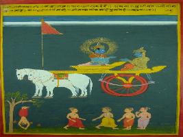 | Description / विवरण | Miniature painting based on Shri Bhagwat Gita depicting Krishna preaching Arjun that in the way birth of an atheist is very rare in the house of a sage, his this avatar is also very rare in the world. |