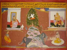 | Description / विवरण | Miniature painting based on Prithviraj Raso depicting a woman worshipping Shiv linga and Kamdev is making aim on her. A king is depicted making love with a woman and an elephant depicted walking to a sage. |