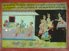 | Description / विवरण | Miniature painting based on Mahabharat depicting Vidur talking to Krishna and saying, to become old for a king and for kingdom is not a good sign. So one should depute the old king Dhrithrashtra. He also says that people neglect on old king in the way deers neglect an old tiger. |