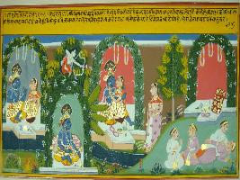| Description / विवरण | Miniature painting based on Geet Govind depicting Various things on moments of Krishna with Radha depicting of Krishna acts of Raas Lila. |