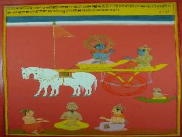 | Description / विवरण | Miniature painting based on Shri Bhagwat Gita. It depicts Krishna preaching Arjun that those who do good to other, they don t have problems and thus they are not destroyed. |