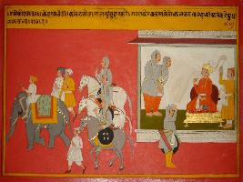 | Description / विवरण | Miniature painting based on Prithviraj Raso depicting Kehroka Todi and Kan Rathore informing Jaichand about marching of Ravan with his army for war with Prithviraj. |