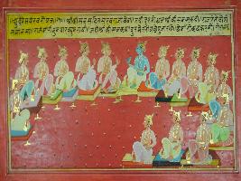 | Description / विवरण | Miniature painting based on Mahabharat depicting Krishna coming to Kauravas as a messenger of Pandavas and sitting among all the Kauravas. Then king Duryodhan asked that Yudhisthir and he both are equals then why Krishna is coming to negotiate. Then Krishna replied and asked why they worshipped Krishna with a cow when he had came. |