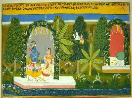 | Description / विवरण | Miniature painting based on Geet Govind depicting Krishna and Radha where Krishna presents his lone to Radha while Kamdev and Rati devi is seen at the upper part of the painting. |