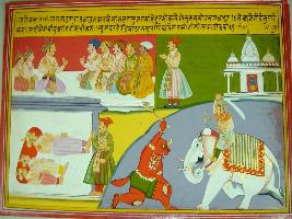 | Description / विवरण | Miniature painting based on Harivansha depicting a king with his two sons talking to his minister. On the upper right side. Below it the king is depicted sleeping with his sons. On the upper left side temple of Krishna is depicted and fighting between Indra and a demon is depicted at the lower part. |