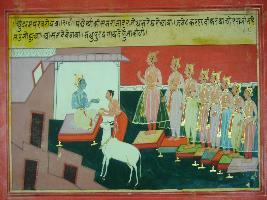 | Description / विवरण | Miniature painting based on Mahabharat depicting Krishna coming. Duryodhan, Karna and other heroes stand up and show respect to him. After that by giving the Madhu purakh cow, they worshipped Krishna. |