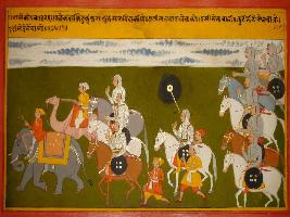 | Description / विवरण | Miniature painting based on Prithviraj Raso depicting marching of the army of Kandarpa Ketu on camelback, horse back and on elephants to fight with Prithviraj. On the upper part of cloudy sky is depicted. |