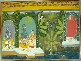 | Description / विवरण | Miniature painting based on Geet Govind depicting Krishna sitting with Radha and talking about their separation at the middle part of painting, to them right, Krishna and Radha is depicted embracing each other. At the extreme left, empty couch is depicted near bank of river Yamuna. |