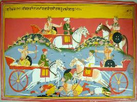 | Description / विवरण | Miniature painting based on Harivansha depicting the scene of fighting between two kings. It is incomplete painting. |