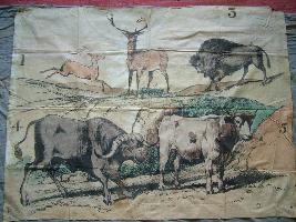 | Description / विवरण | It is a rectangular piece of painted cloth. Some animals are depicted on it for example cow, ox, deer, etc. It is a forest picture. |