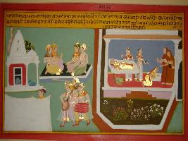 | Description / विवरण | Miniature painting based on Sanskrit drama Malti Madhav depicting Lawangika and Kamdaki come to meet Malti who is sleeping that time and whose condition is miserable in the love with Madhav. Then Lawangika wake her up and when Malti saw Kamandaki she touches her feet. |