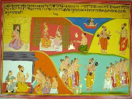 | Description / विवरण | Miniature painting based on Harivansha depicting Prajapati sitting at the upper right part. To his left, Marriage ceremony of daughter of Prajapati is going on. At the top left Narad is shown sitting in yaan and shown talking to Prajapati at the lower side, a sage is shown sitting with his wife and five sons. To their left, Narad Muni is shown talking to the sage s disciples. |