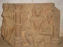 | Description / विवरण | An independent sculpture of 4 armed Kartikeya sitting in Lalitasana, attributes from right below 1 missing 2 sword 3 pot 4 arrow 5 shield 6 missing 7 broken but probably bow 8 cock. He is tri headed, wearing necklace, garland, waist band, and seated on peacock. There is also a depiction of 4 handed Ganesh below the Kartikeya. On right side of Kartikeya a figure of female chanwar bearer holding chanwar in left hand, she is adorned with jewels. |