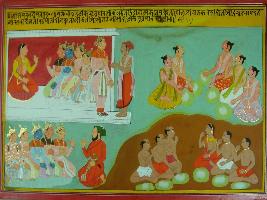 | Description / विवरण | Miniature painting based on Mahabharat - Adi parva depicting Pandavas sitting in front of Kunti. Another corner depicts Pandavas sitting and discussing and in lower part Pandavas taking food with Kunti. |