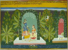 | Description / विवरण | Miniature painting based on Geet Govind. Krishna is depicted here talking and sitting with Radha in Vrindavan. Kamdev is depicted sitting on a tree top and making aim of flower arrow to Krishna. |