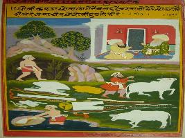 | Description / विवरण | Miniature painting depicting a washerman washing clothes, mean while a cow maid steals his clothes and later he is looking for his clothes. |