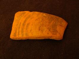 | Description / विवरण | It is a well fired thin fabric potsherd. It is painted in black colour, concentric circle pattern on red background. This ware is associated with OCP. |