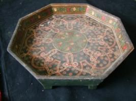 | Description / विवरण | It is an octagonal wooden tray with upwardly projected rims. In the centre a green circle with colourful floral pattern is seen. |