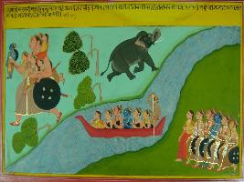 | Description / विवरण | Miniature painting based on Mahabharat - Adi parva depicting Pandavas crossing river Ganga and coming towards north side. While on the other parts Bhimsena is carrying his brother including Draupadi. |