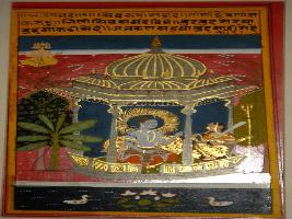 | Description / विवरण | Miniature painting based on Sarangadhar. Shiv and Parvati are depicted sitting in a shrine, Lord Brahma is depicted in the upper part. |